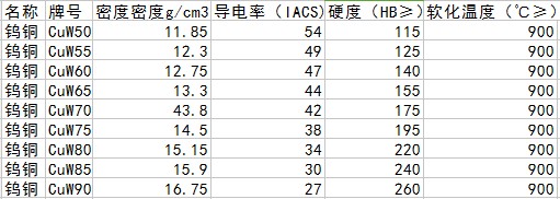廣毅榮鎢銅合金性能表